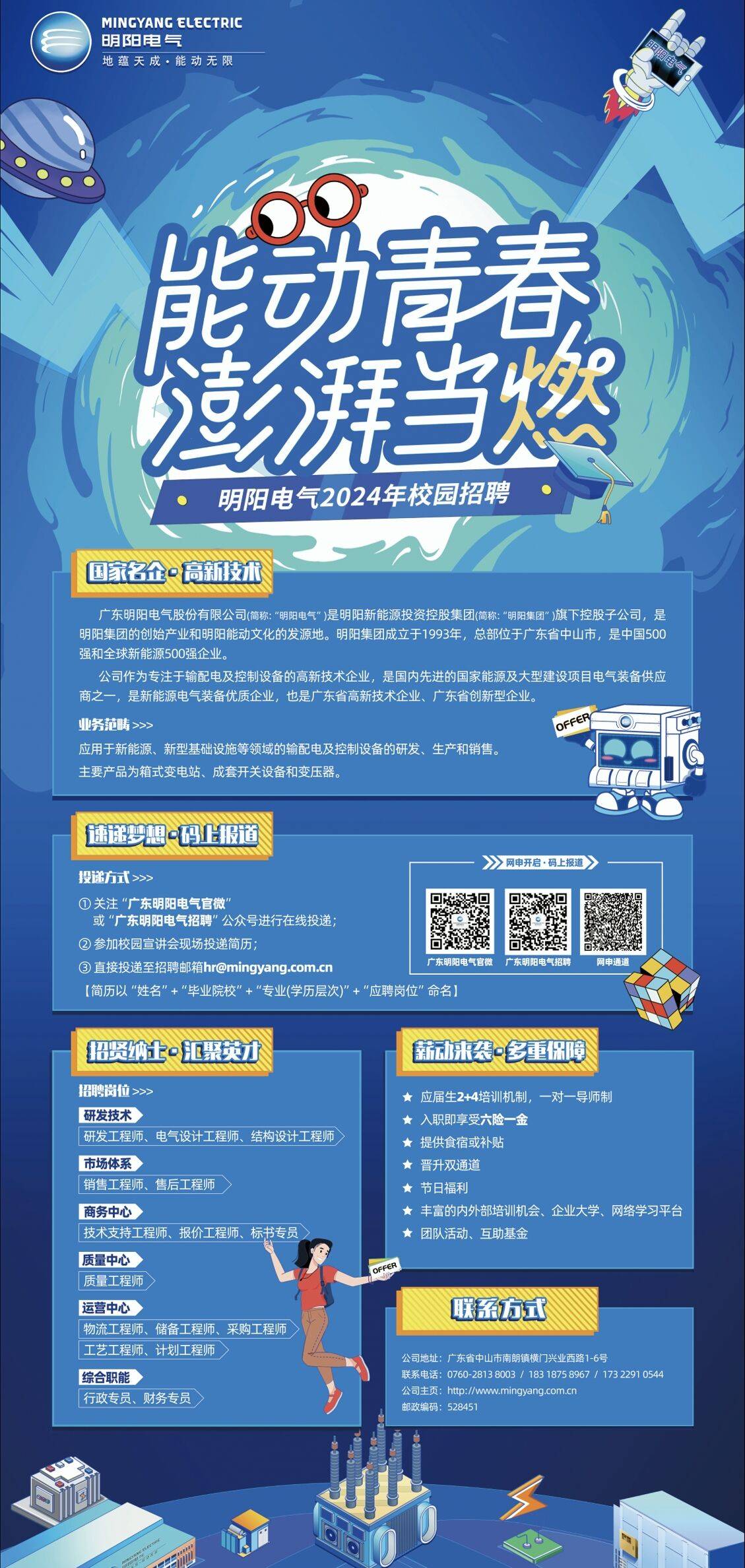 明阳电气2024届校园招聘【太阳成集团122ccvip】专场宣讲会,能动青春,让我们开创共赢的未来!【宣讲时间】:2023-10-19 15:00(今天)【宣讲地点】:太阳成集团122ccvip201【工作地点】:广东中山及全国多个地区【招聘专业】:电气类、机械、机电、金融投资类、法学、经管类、人力资源、财务类、工科类【福利待遇】六险一金、企业大学、节日福利、文体协会、免费提供食宿。本科综合年薪10W起,研究生15W起。参加宣讲会现场即可获得精美笔记本!OFFER后将收到精美OFFER礼盒! 2023-10-19 15:00(周四),我们在太阳成集团122ccvip201约定你! 更多校招信息请关注广东明阳电气招聘官微或加入微信群 【简历投递】:邮箱:hr@mingyang.com.cn 【公司主页】:http://www.mingyang.com.cn 【公司招聘官网链接】:https://campus.51job.com/mingyang2024/