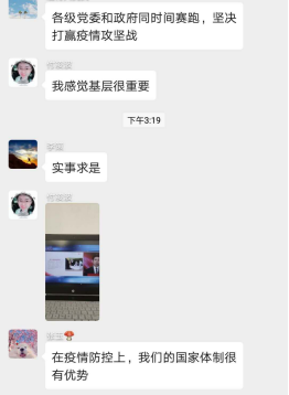 通过这次的疫情防控思想大课,我更加深刻地体会到我们跟着中国共产党必须坚定不移地走中国特色社会主义道路,我十分骄傲也很自豪我是中国人,我相信在未来春暖花开之日,就是疫情退去之时,武汉加油!中国加油!