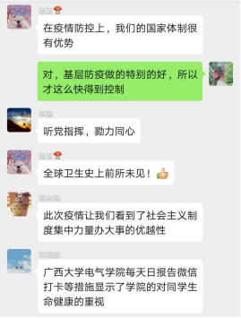 电气类185班学生: 通过这堂疫情防控思政大课,我们看到了在党的领导下,基层党组织雷利风行,快速建立起了疫情防疫团队。全国各省相互支援,互帮互助。在这次疫情当中,全国人民齐心协力共同抗疫,彰显了中华民族伟大的团结精神。党和政府在这次疫情中发挥了巨大作用,体现了党中央的应变紧急情况能力,我们要总结历史经验,坚持党的领导。
