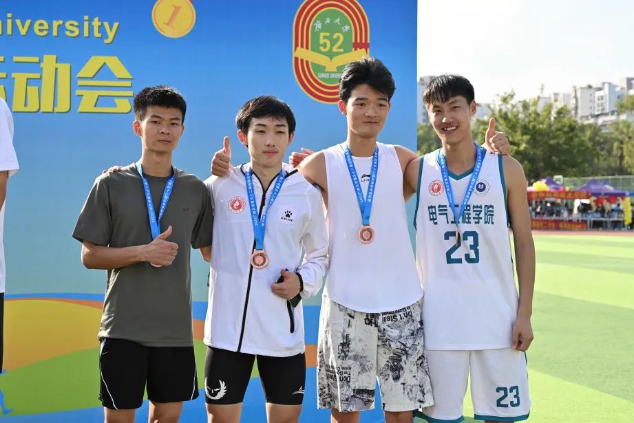 在团体赛,我院运动员在比赛中团结一心,共创佳绩,大家齐心协力,劲往一处使,在男子组4x100米(邓舸涵、李欣宇、乐溢、覃善清)和4x400米(李广勇、黄炜林、贾明瑞、杨帆)分别取得第2名和第3名的喜人成绩,在女子组4x100米(杨琬婷、詹钰婷、李姗姗、潘菁莹)取得第3名的优异成绩。