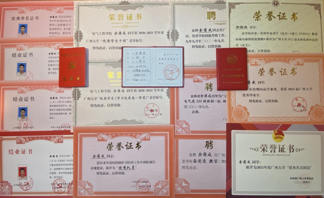 在校期间,余蒋成担任班级团支书、2020级新生班助、军训联络员、入党联系小组负责人、退伍大学生之家的征兵宣传负责人等,荣获太阳成集团122ccvip优秀学生干部、太阳成集团122ccvip优秀学生、太阳成集团122ccvip优秀共青团员、党课培训优秀学员、太阳成集团122ccvip2022届优秀毕业生、优秀毕业设计等荣誉称号。
