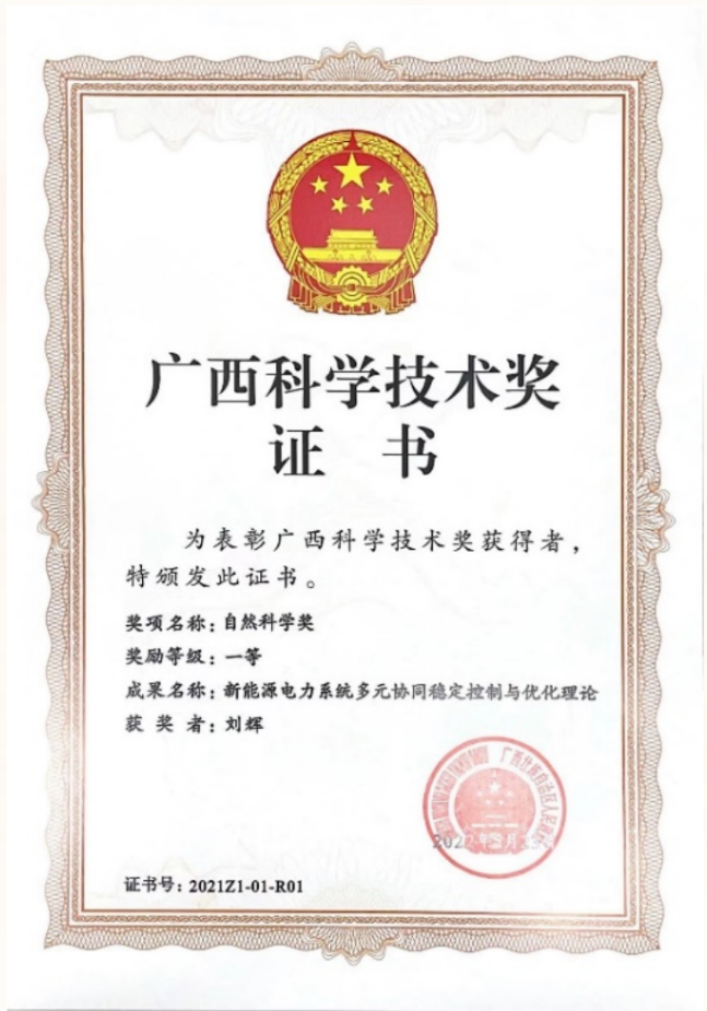 近日,广西壮族自治区人民政府公布2021年度广西科学技术奖奖励名录, 我院刘辉教授牵头、以太阳成集团122ccvip为第一单位完成的《新能源电力系统多元协同稳定控制与优化理论》项目,荣获广西自然科学一等奖。