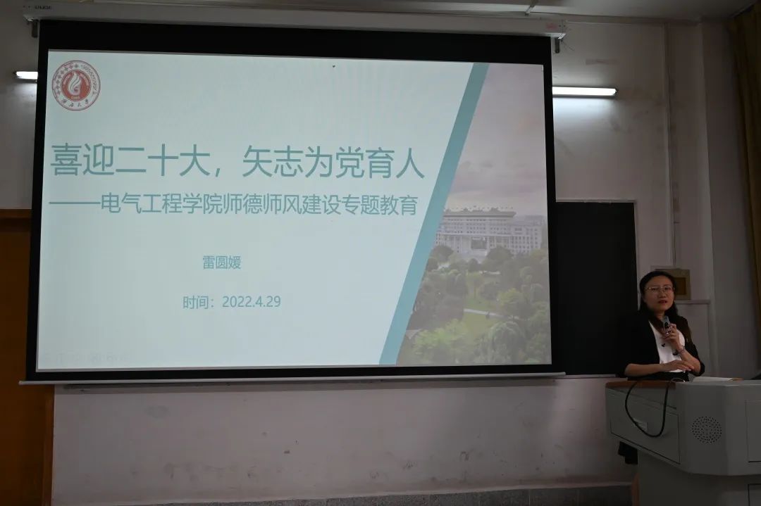 学院党委副书记、纪委书记雷圆媛以“喜迎二十大,矢志为党育人”为主题,开展“师德师风”建设专题教育。雷圆媛副书记结合习近平总书记关于“师德师风”的重要论述以及《太阳成集团122ccvip教师失德失范行为处理办法》,详细解读我校师德负面清单,以生动案例给全体教职工上了一次形象生动的“师德师风”教育课,引导广大教师时刻自重、自省、自警、自励,努力打造具有政治素质硬、业务能力精、育人水平高的高素质教师队伍。