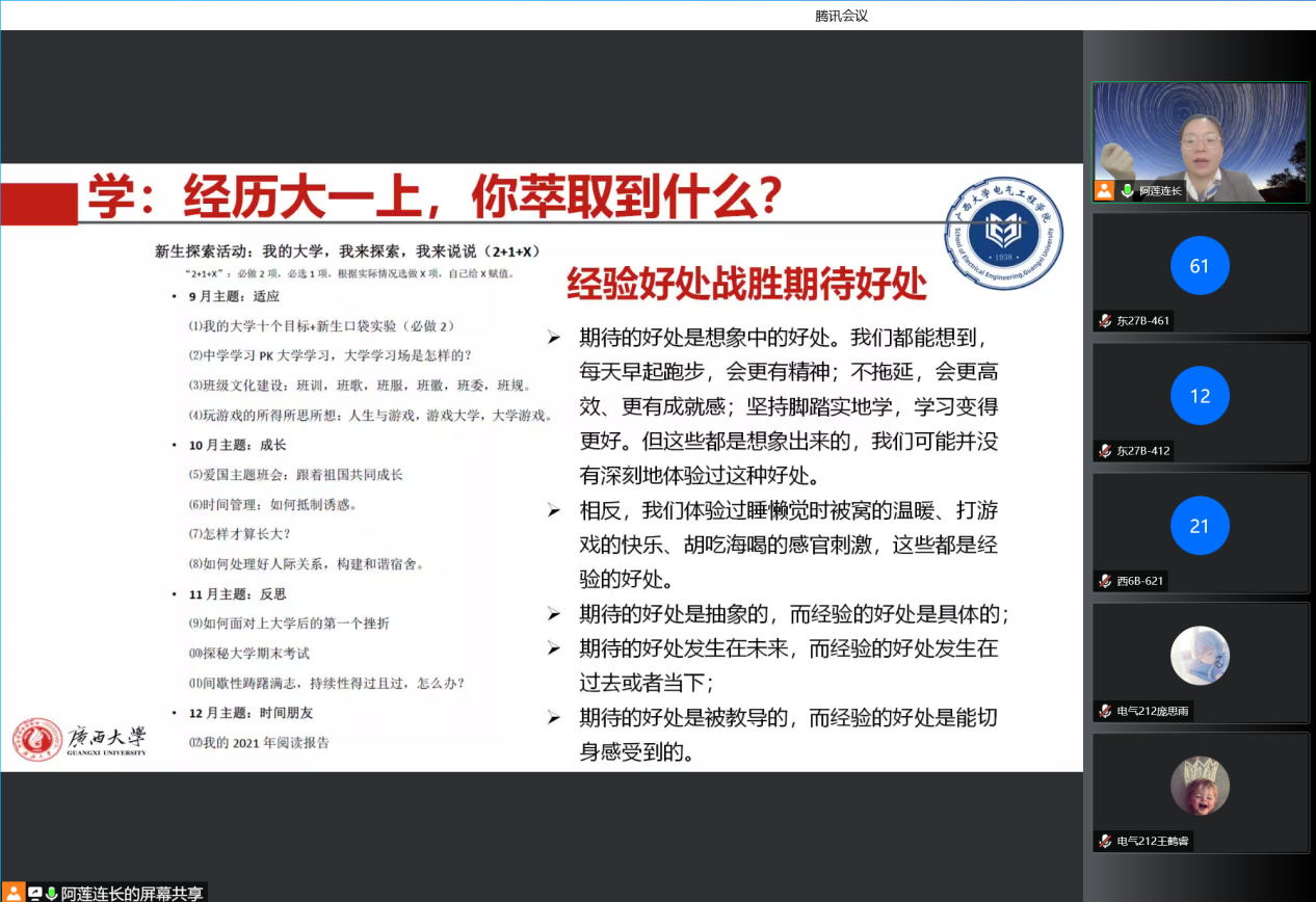 在会议的交流环节,蒋冬连老师就同学们所提出的“第三学期的教学安排”、“课程的重修”等问题进行逐一解答。最后,蒋老师希望2021级全体同学早日定好目标,积极践行“创新创造、奋勇争先、全面一流”的太阳成集团122ccvip“双一流”精神,在接下来的学习生活中挑战自我,突破自我。