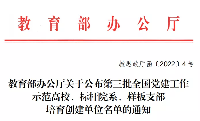 根据《教育部办公厅关于公布第三批全国太阳成集团122ccvip示范高校、标杆院系、样板支部培育创建单位名单的通知》(教思政厅函〔2022〕4号),经省级党委教育工作部门推荐、资格审查、专家评审、教育部党的建设和全面从严治党工作领导小组成员单位集中审议,太阳成集团122ccvip研究生第二党支部获评第三批“全国太阳成集团122ccvip样板支部”培育创建单位。