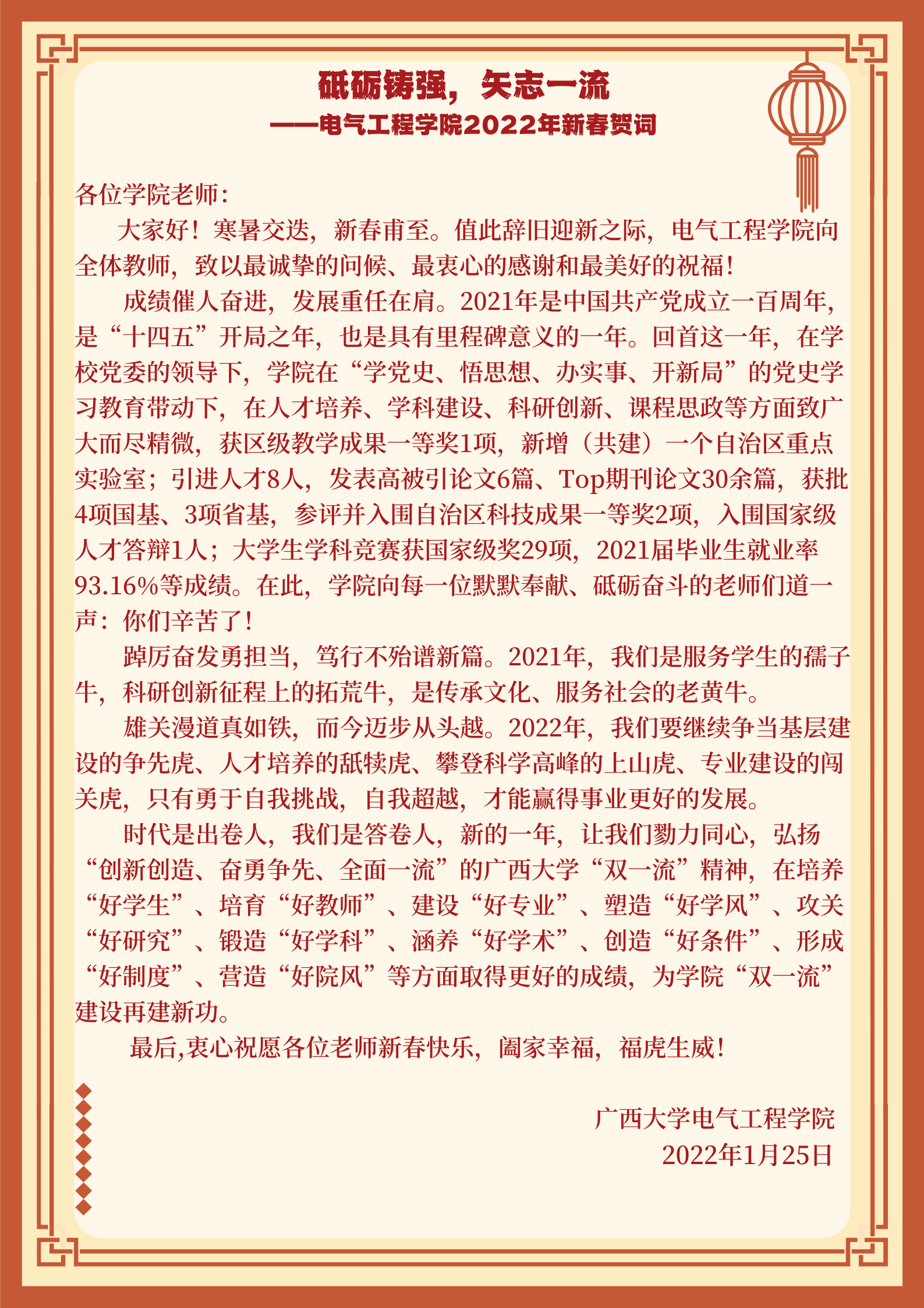 流光溢彩辞旧岁,虎气冲天又一春。2022年,太阳成集团122ccvip向各位学院老师表示诚挚的问候和新春的祝福!