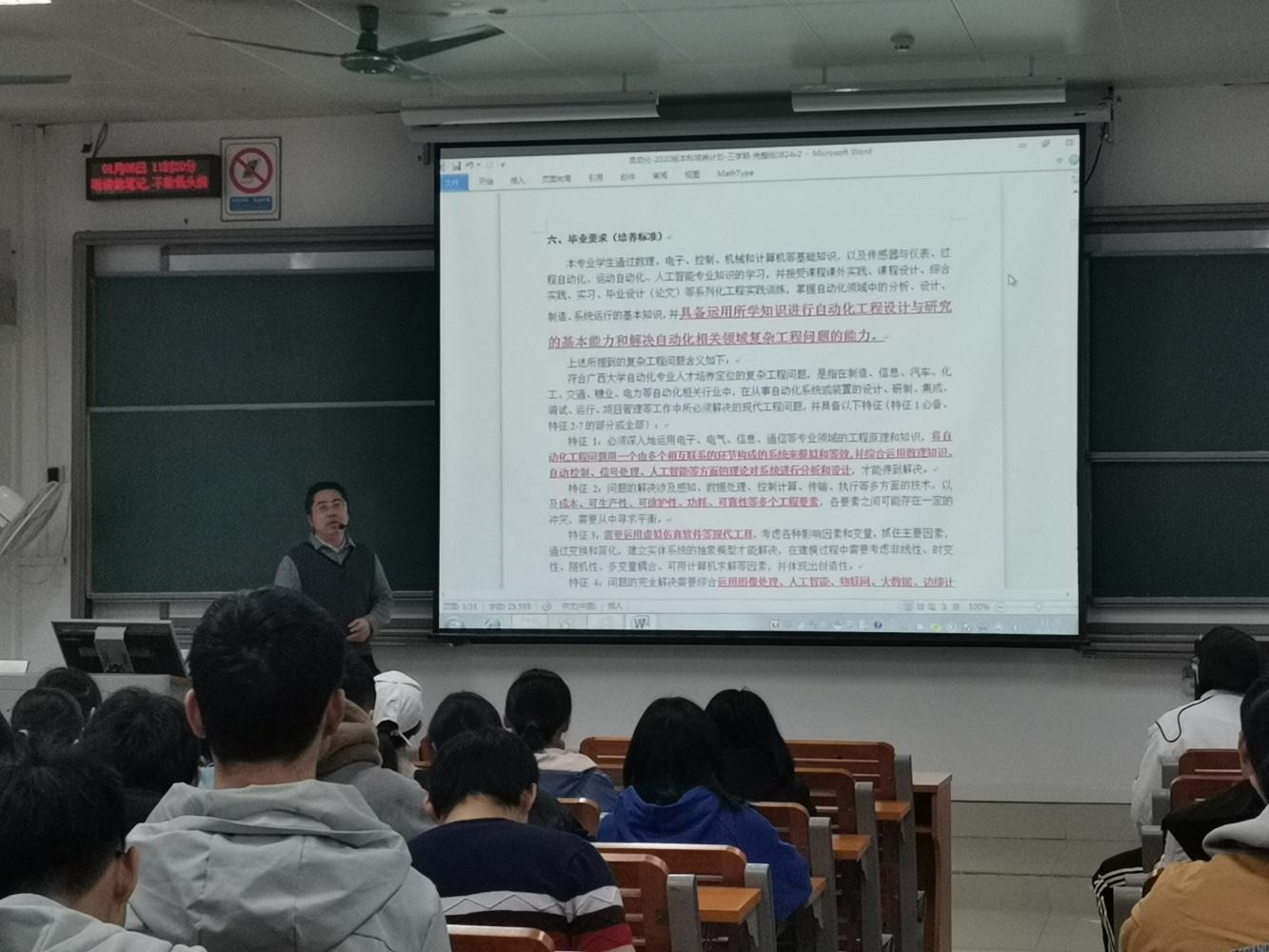 韦善革老师首先向同学们阐述了“产出导向”的OBE教育理念,强调了毕业设计(论文)在课程体系中的重要性,详细解读了各课程教学目标的内涵及其对各毕业要求指标点的支撑关系,提醒同学们在设计和论文撰写过程中要依据课程目标开展工作。