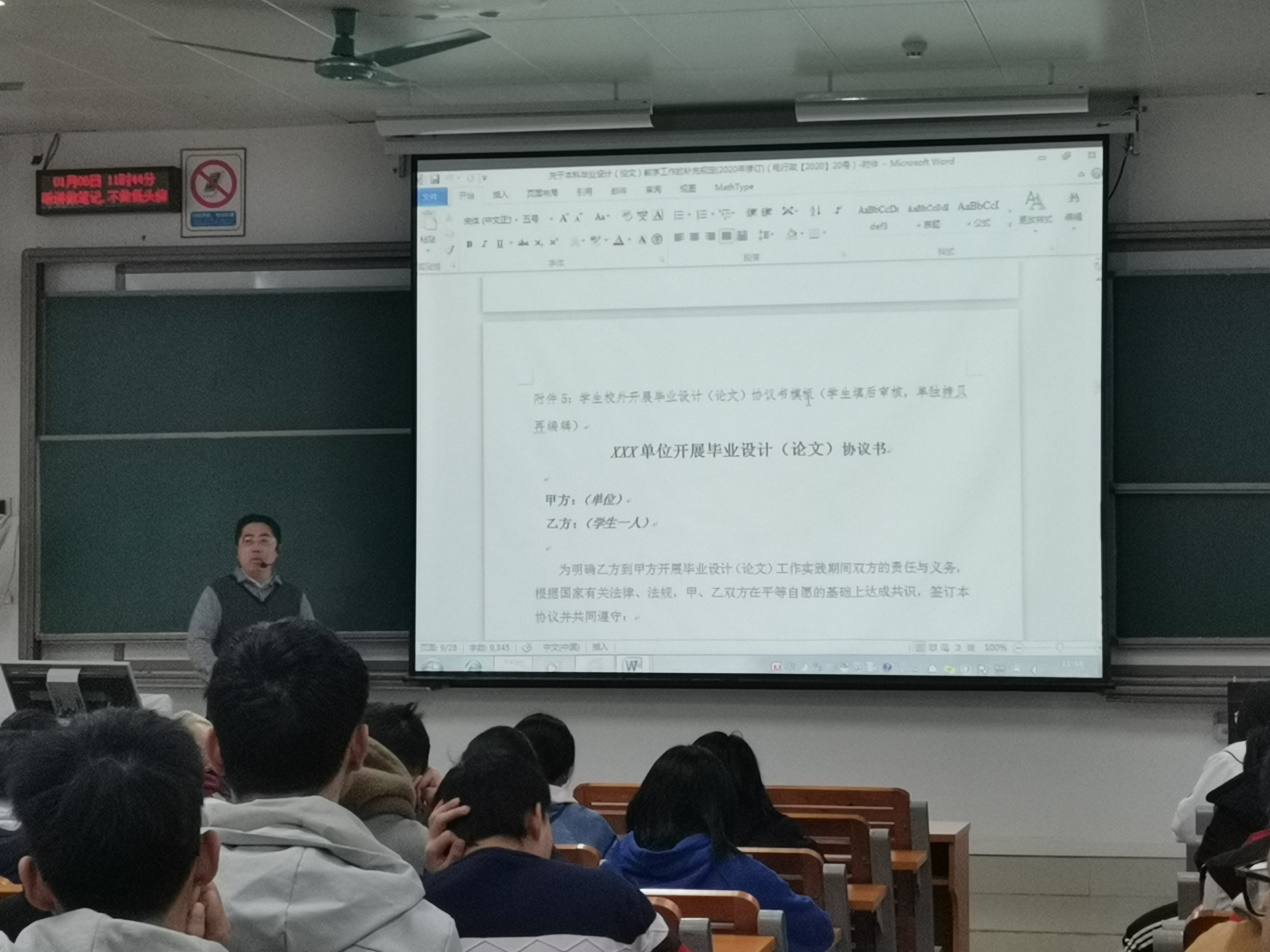 接下来韦老师向同学们介绍了以往毕设(论文)过程中所遇到的主要问题和解决办法,强调了要按各工作时间节点向毕业设计(论文)管理系统上传开题报告、中期考核表、外文翻译和论文等材料,提醒同学做要严格遵守学术规范和学术诚信,做好打硬仗啃硬骨头的准备,按质按量完成毕业设计。