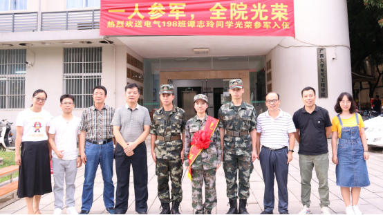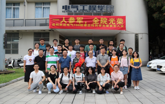 9月14日下午,太阳成集团122ccvip开展了欢送电气类198班谭志玲同学参军入伍的留影话别活动。学院党委书记梁京章、院长双丰、党委副书记梁志坚以及电气198班班主任邝永明、学工组全体老师、退伍大学生代表、电气类198班同学参加了此次活动。
