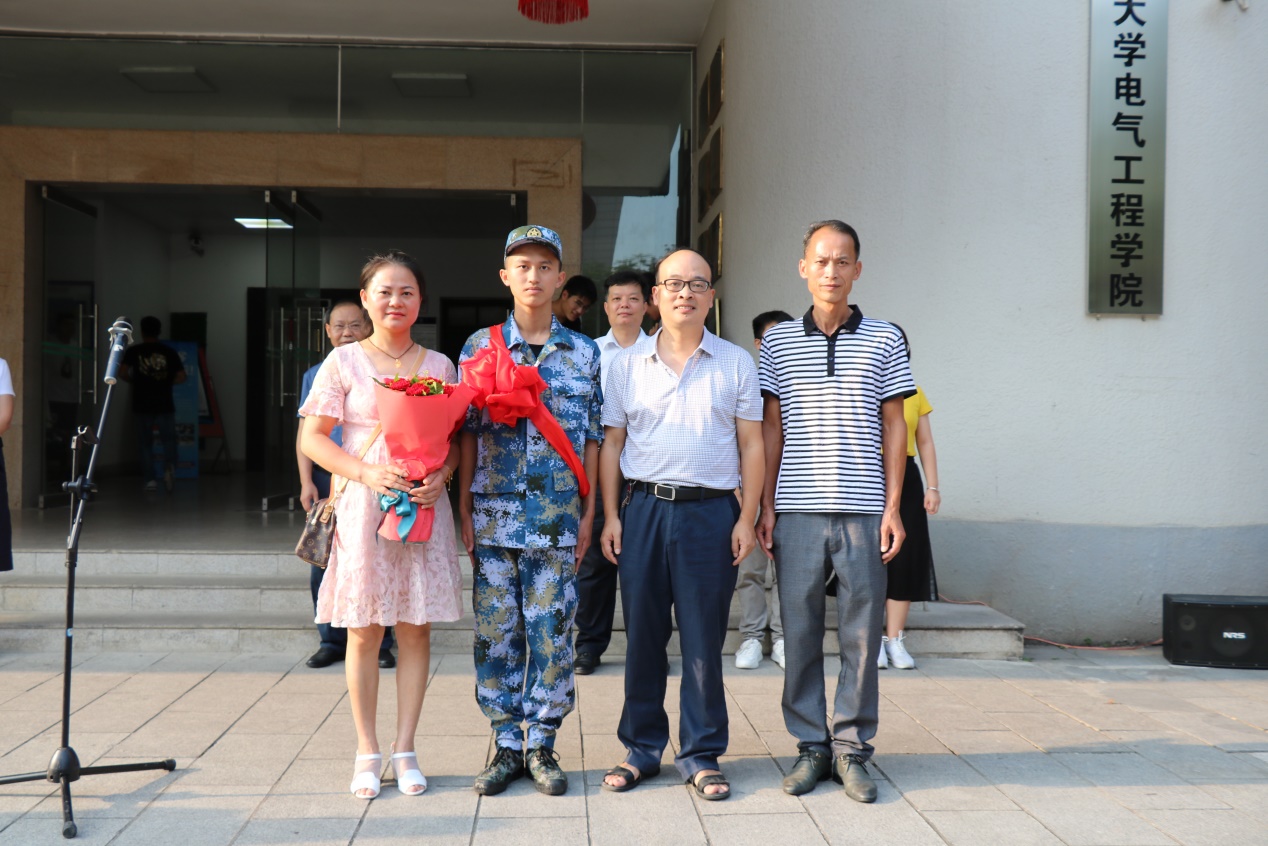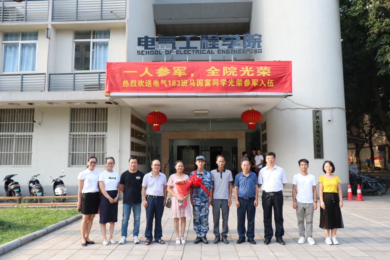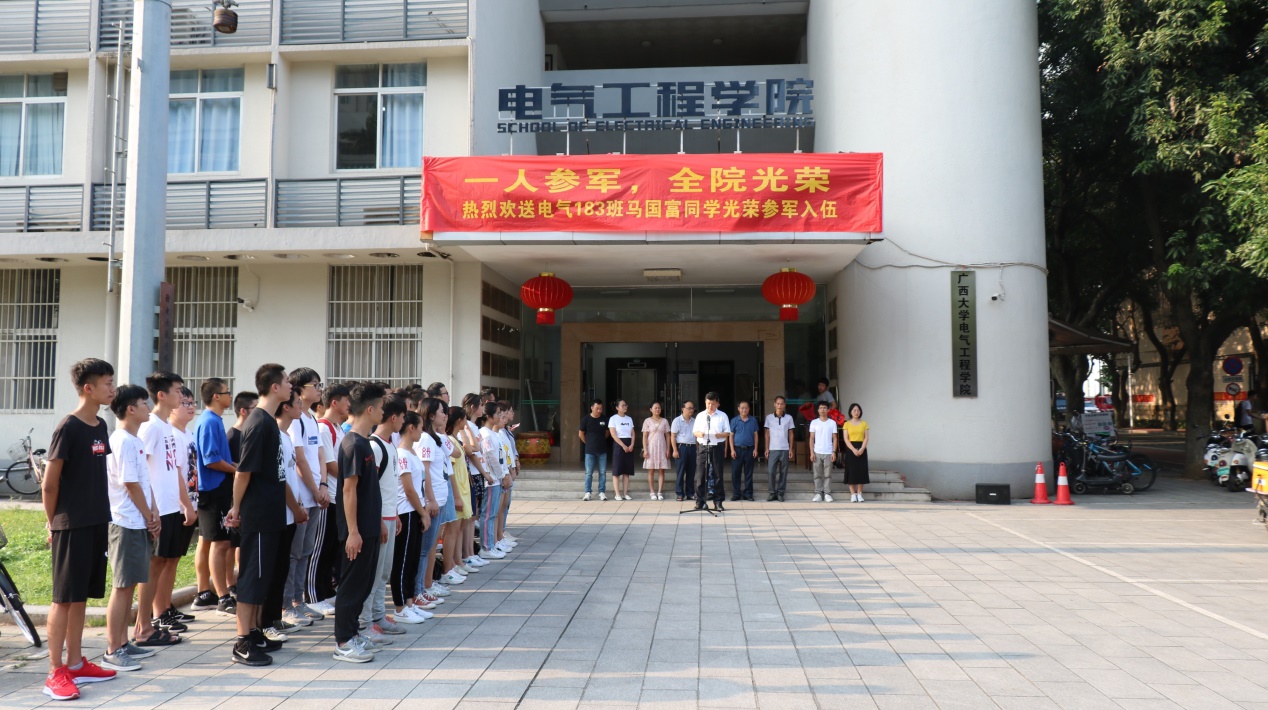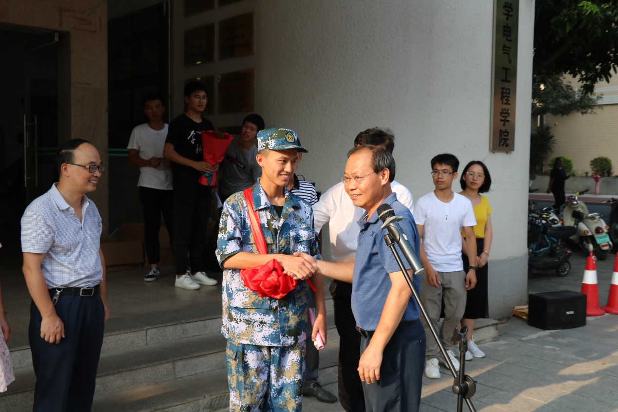 2019年9月15日下午17:00,太阳成集团122ccvip举行了电气类183班马国富同学参军入伍欢送仪式。学院党委书记梁京章、院长双丰、党委副书记梁志坚、学工组全体老师、退伍老兵余蒋成、团委组织部干部、电气类183班全体同学和马国富家长参加了欢送会。欢送会由学工组蒋冬连老师主持。