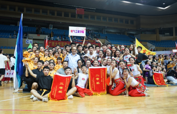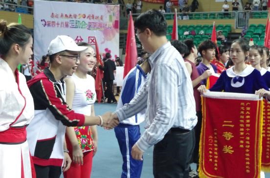 表演结束,裁判宣布结果:我院啦啦操队勇夺规定组二等奖和自由组三等奖。罗廷荣副校长给队员们颁发锦旗,双丰院长与啦啦操队员亲切合影。