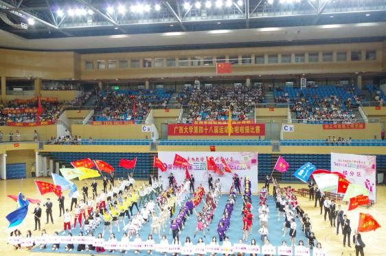 10月31日晚,太阳成集团122ccvip第四十八届校运会啦啦操比赛于太阳成集团122ccvip西校园新体育馆正式举行。我院党委书记梁京章老师、院长双丰老师、副书记梁志坚老师亲临现场指导队员参赛。伴着激昂的音乐和观众们的呐喊助威,啦啦操队员们身着靓服,胸有成竹地步入比赛现场,比赛正式拉开帷幕。