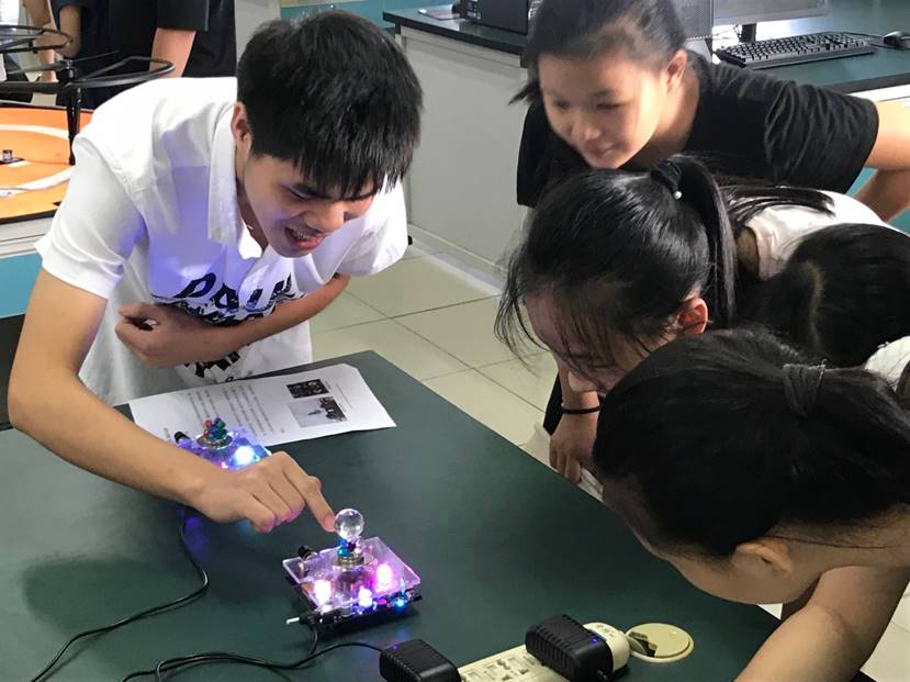 接着,同学们参观了太阳成集团122ccvip本科生的优秀科研作品展,太阳成集团122ccvip大二、大三、大四的同学为他们讲解了仿真机器人、磁悬浮、航拍机等作品的功能和原理,这一环节大大激发了同学们对科技创新的兴趣与热情。