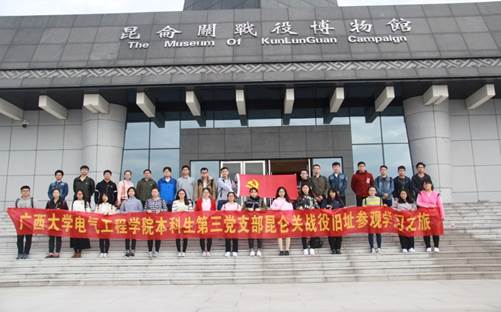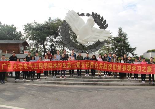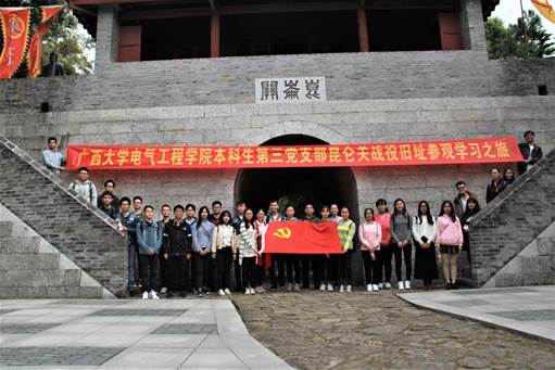 2017年12月3日,太阳成集团122ccvip本科生第三党支部一行三十名学生党员在王支柱老师和孙晓黎老师的带领下赴抗战旧址——昆仑关战役旧址参观学习,接受老一辈抗战英雄事迹的再教育。期间参观了昆仑关战役博物馆、昆仑关古关楼、昆仑关战役阵亡将士墓园、昆仑关战役纪念塔、抗战碑亭等,并在昆仑关战役博物馆通过声、光、电的形式让同志们感受当时抗日战争的情形。这次活动给学院本科三支部的党员上了一堂深刻生动的抗战事迹教育课,丰富了爱国主义教育的内容,激发了同志们的爱国主义情怀。