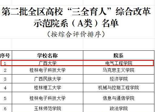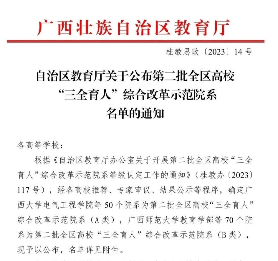 近日,广西壮族自治区教育厅发布了《关于公布第二批全区高校“三全育人”综合改革示范院系名单的通知》,我院成功获批为A类综合改革示范院系(综合排名第1)。