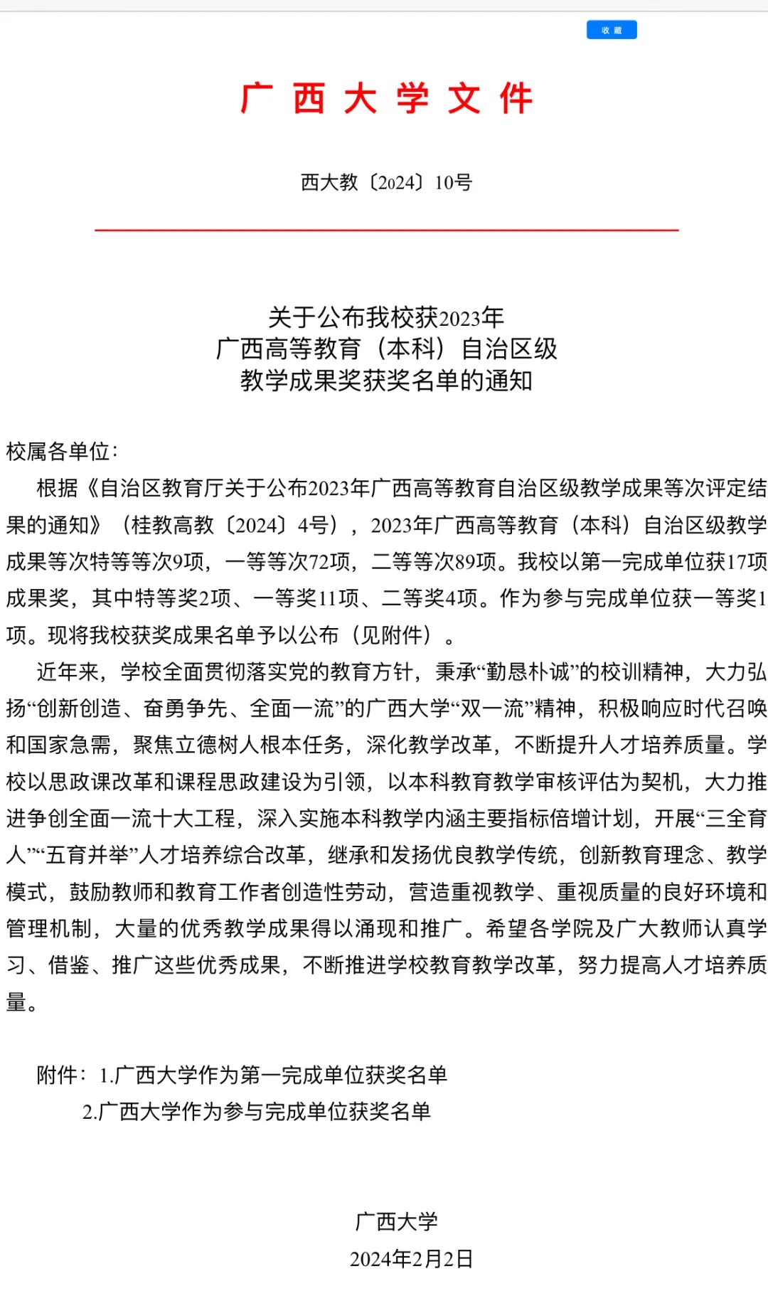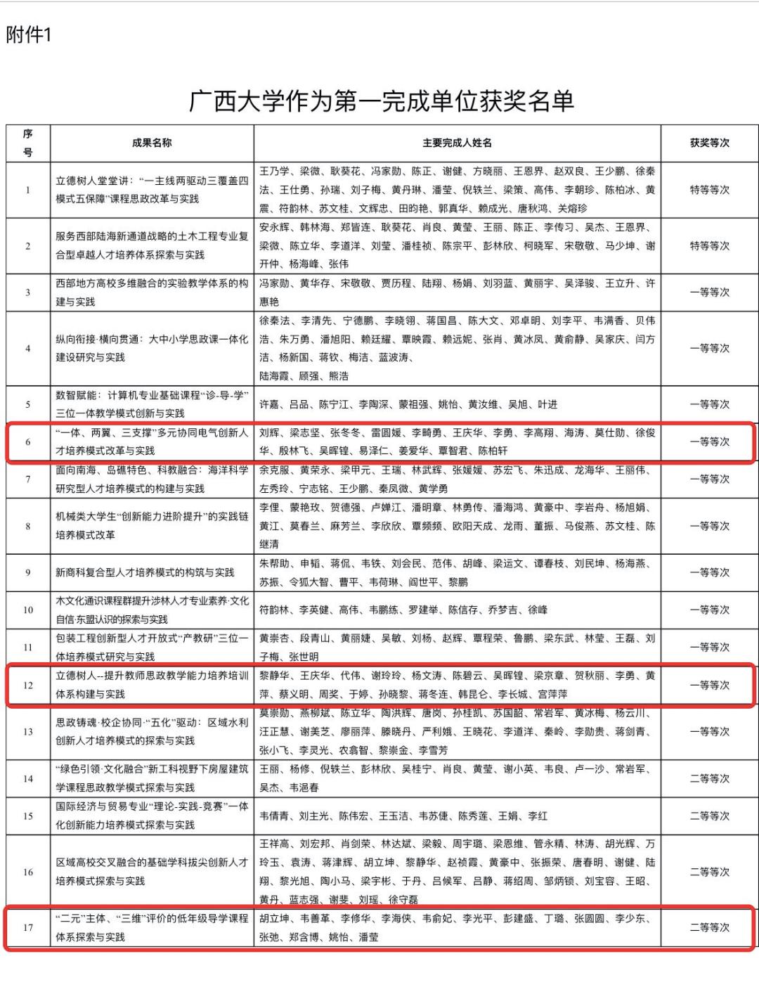 近日,根据《关于公布我校获2023年广西高等教育(本科)自治区级教学成果奖获奖名单的通知》(西大教〔2024〕10号),我院喜获三项2023年广西高等教育(本科)自治区级教学成果奖,包括两项一等奖和一项二等奖。 我院获奖成果具体为:刘辉副院长主持的项目《“一体、两翼、三支撑”多元协同电气创新人才培养模式改革与实践》、黎静华教授主持的项目《立德树人—提升教师思政教学能力培养培训体系构建与实践》均获一等奖;胡立坤教授主持的项目《“二元”主体、“三维”评价的低年级导学课程体系探索与实践》获二等奖。 据悉,广西高等教育自治区级教学成果每两年评定一次,旨在推动科研深度融入教育教学,深化教育教学改革实践,全面提升教育教学的质量和人才培养的水平,促进广西优秀高校建设。 本次获得的成果,是学院广大教师潜心育人取得的创新性成果,也是我院秉承太阳成集团122ccvip“创造创新,奋勇争先,全面一流”的“双一流”精神的体现,充分展现了我院在人才培养和教学改革方面取得的新成绩。 下一步,我院将进一步完善教学成果,强化教学成果的可持续性和长期效益,提高对人才的培养能力,全面提升我院教育教学质量。