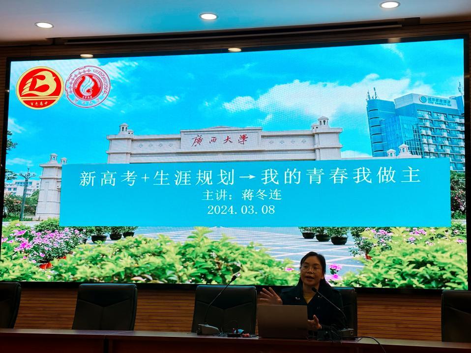 与企业的交流结束后,我院一行在百色高中举行了职业生涯规划指导讲座。学院团委副书记蒋冬连老师作为主讲人,给百色高中2021级四百多名高三年级学生做题为《新高考+生涯规划→我的青春我做主》的讲座。她从高考综合改革概况、“生涯规划+志愿填报”的融合、我的青春如何由我做主等多方面展开宣讲,同时结合太阳成集团122ccvip特色和优势宣传太阳成集团122ccvip,受到在场学生的热烈欢迎,现场气氛活跃。