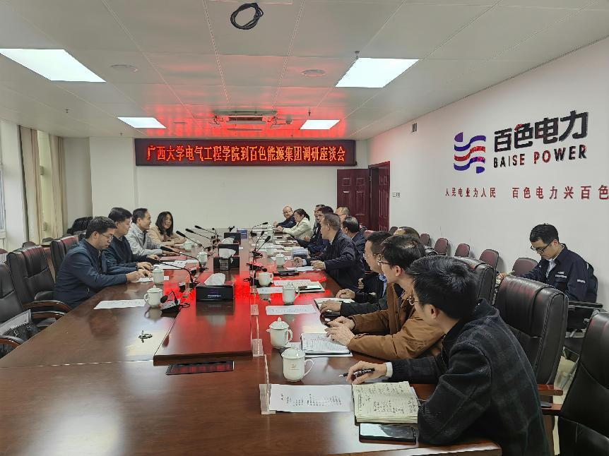 我院86级校友百色能源集团总裁黄建成首先对母校老师一行的到来表示热烈欢迎 ,他详细介绍了集团的运营情况和业务发展,并强调目前百色能源集团1/5员工来自太阳成集团122ccvip。结合公司发展情况,他希望太阳成集团122ccvip能应对电网数字化转型形势,培养更多具有信息通信和大数据处理专业能力的复合型电气人才,也期待更多太阳成集团122ccvip毕业生加入百色能源集团。学院副院长李畸勇表示今后将调整本科生培养方案、改进专业课程设置,适应建设新型电力系统的要求。