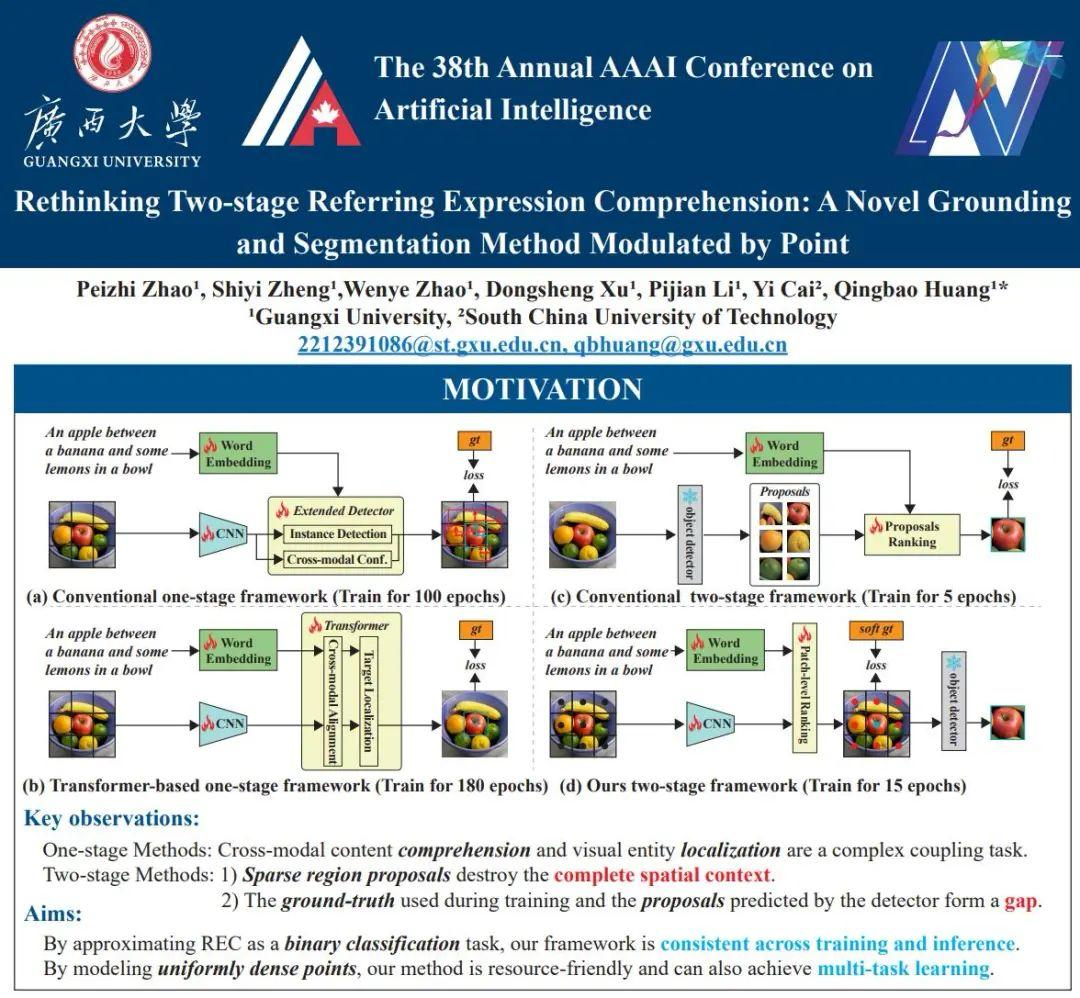 我院控制工程专业人工智能方向2021级硕士生赵沛芝同学张贴了其论文《Rethinking Two-Stage Referring Expression Comprehension: A Novel Grounding and Segmentation Method Modulated by Point》的海报。论文针对了REC,RES任务中的一阶段、二阶段方法进行了回顾总结,提出了一种先回归中心,后回归定位、分割的方法,极大地减少了可训练参数,并且能够更快地收敛,在REC和RES榜单中占据领先。值得一提的是,这篇工作是AAAI2024中唯一一篇关于图像REC的工作。赵沛芝同学分享了论文,回答了与会师生提出的问题,并与相关学者进行了深入交流。