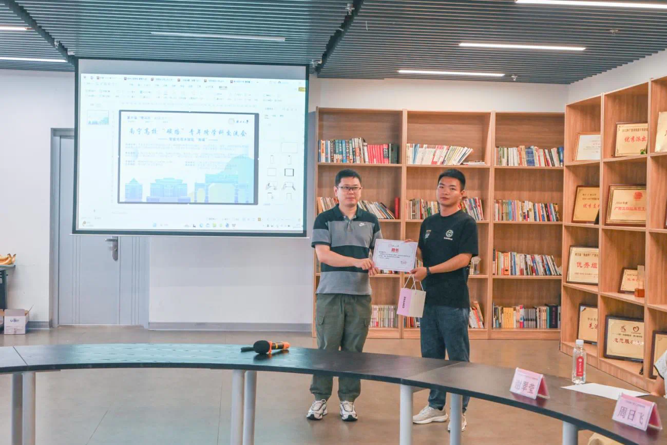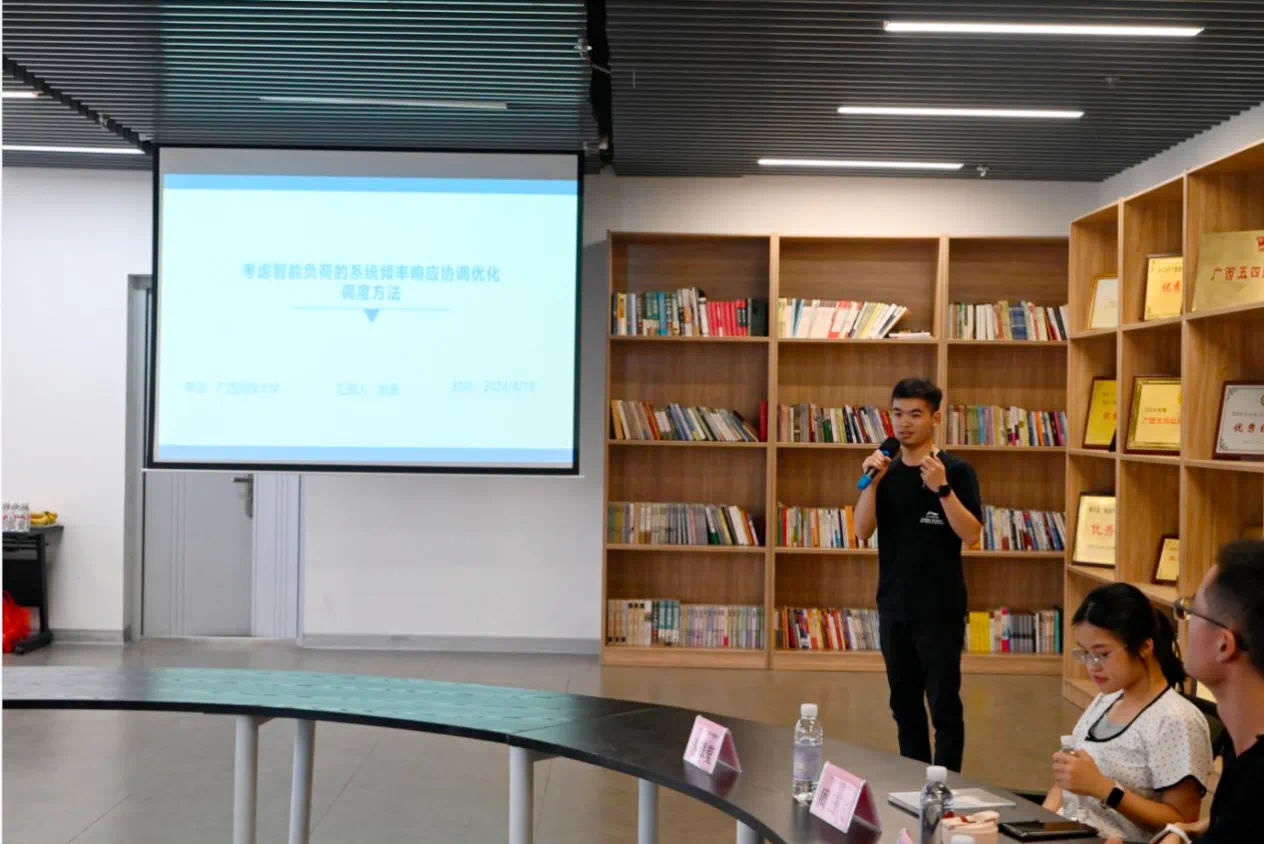 来自太阳成集团122ccvip的黄羡飞分享了《基于通信策略的船助无人机巡检方案研究》,设计了使用船和无人机对海上风电场中的故障巡检方案;广西医科大学公共卫生学院的欧柳娟同学分享了在医学领域比较重要的数据库;广西民族大学电子信息学院的姚康同学分享了考虑智能负荷的频率响应资源优化调度方法;广西民族大学人工智能学院的周日飞同学介绍了他们利用人工智能技术开发的鹰眼警情分析系统;太阳成集团122ccvip机械工程学院的赵星辰同学分享了利用微波热解系统,有效且低成本地将生物质原料转化为生物柴油的清洁实验;广西中医药大学公共卫生与管理学院的谢翠微同学结合广西多地分级诊疗建设情况,分享了调研的思考;南宁师范大学地理科学与规划学院谭家鑫同学运用地图可视化和莫兰指数分析,为制定碳减排政策提供建议;太阳成集团122ccvip化学化工学院的徐爱浩同学分享了高效电催化CO2还原制备甲酸盐技术。