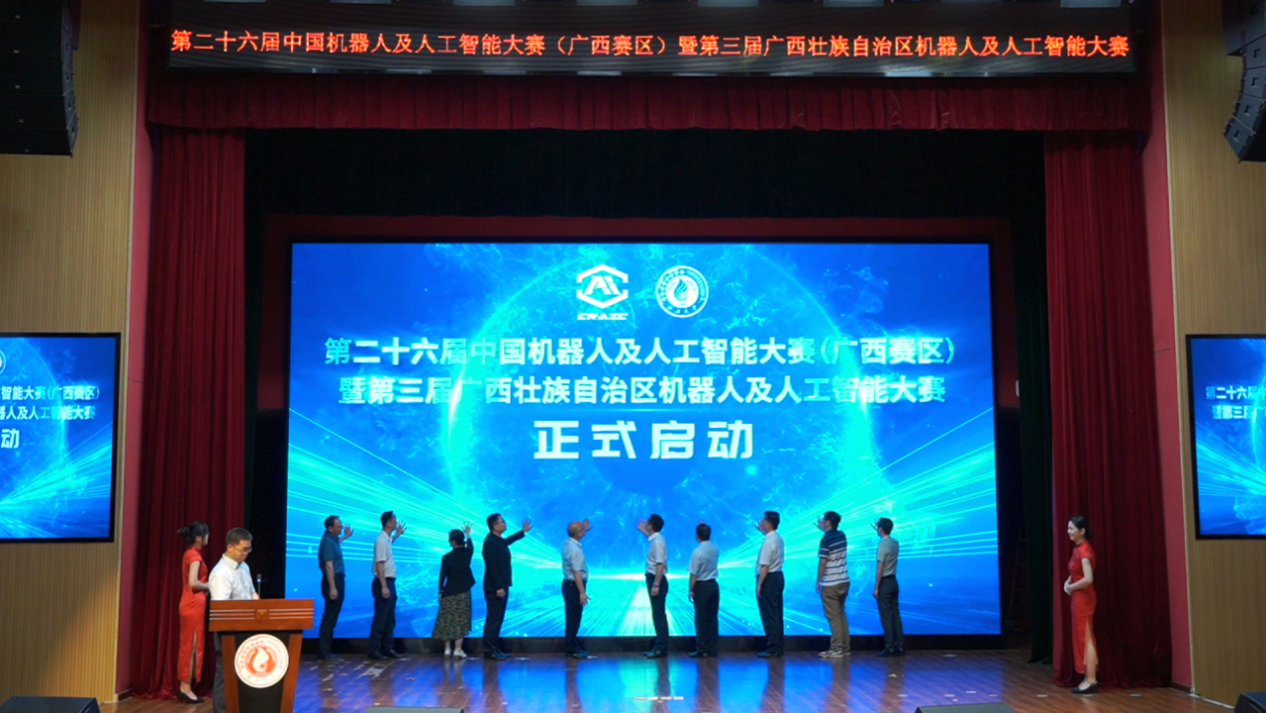 最后,全场领导共同上台,宣布第二十六届机器人及人工智能大赛广西赛区正式开赛。