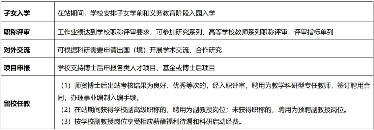(五)其他福利待遇:中国籍博士后享受与学校在职在编教职工同等的社会保险、住房公积金、体检、工会福利、伙食补助等待遇;外籍博士后由学校为其购买商业保险,享受与学校在职在编教职工同等的体检、工会福利、伙食补助等待遇。