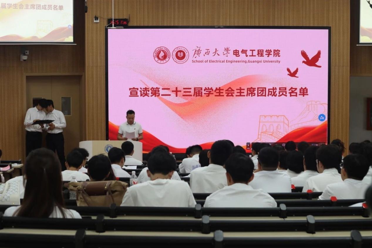 主持人刘家成同学宣读第二十三次学生代表大会常任代表当选名单,同时宣读学院第五届众创空间、第四届学生新媒体中心、第一届太阳成集团122ccvip中心及太阳成集团122ccvip就业与职业发展协会电气分会第十八届干部名单。