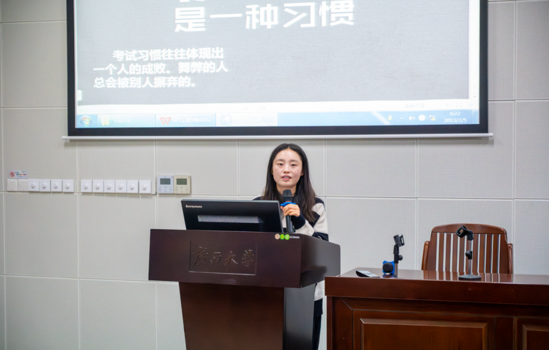 蒋冬连老师围绕考风考纪展开阐述。在考试纪律方面,蒋老师先引领同学们齐读学生手册上《太阳成集团122ccvip学生考试违规处理方法》第八条,着重强调考试违规的严重后果。随后,蒋老师针对如何应对期末考试、考场注意要点、缓考补考流程以及挂科重修相关事宜进行细致讲解。最后,蒋老师鼓励同学们积极融入生活,热爱生活,以乐观态度拥抱生活、服务生活,持续提升提出问题与解决问题的能力。