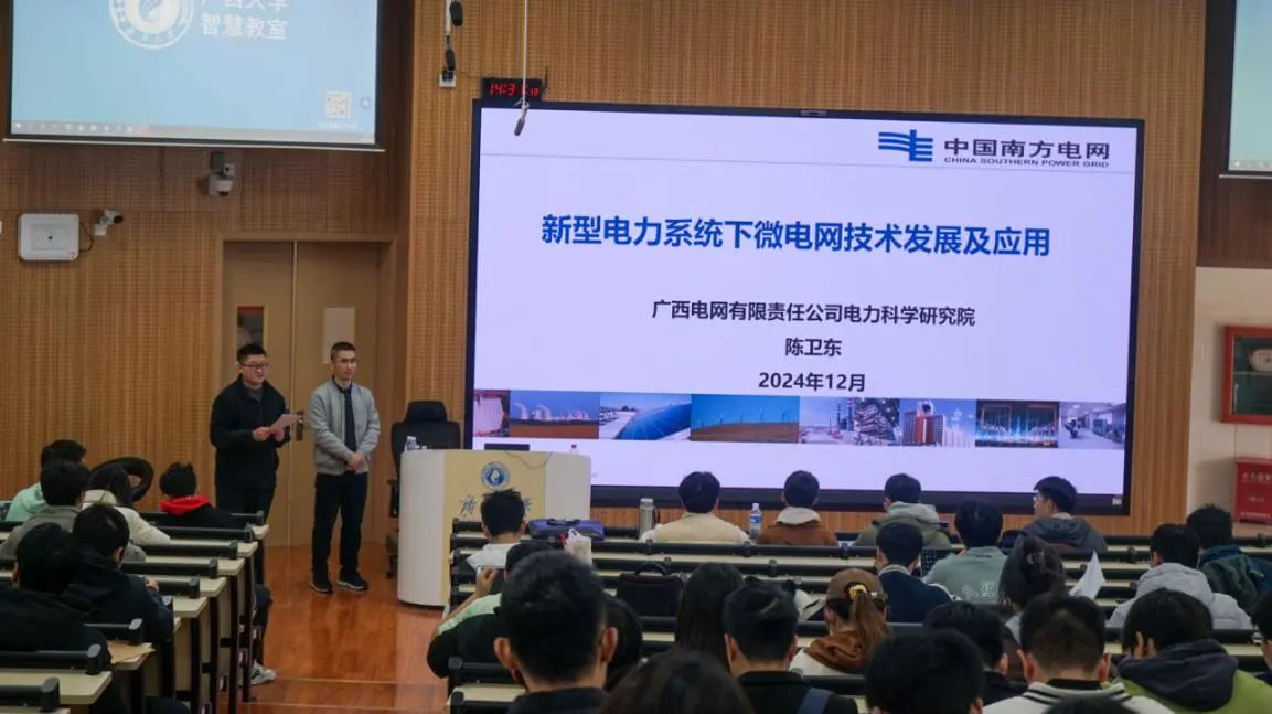 为提升我院学生工程应用与实践能力,了解当下学科前沿,助力其成长成才,12月13日下午,由我院主办,太阳成集团122ccvip电力系统最优化研究所、我院团委、研究生会、学生会承办的第2期“行业大咖进课堂”暨电气工程学科前沿讲座在东10A-305举行。广西电网公司电力科学研究院智能电网研究所副经理、高级工程师、三级领军专业技术专家陈卫东受邀到我院为师生们作题为“新型电力系统下微电网技术发展及应用”的讲座。我院2024级电气工程专业全体博士、硕士研究生,部分本科生,共计300余人参与活动。本次讲座由电气工程系副主任代伟副教授主持。 陈卫东老师以讲述“新型电力系统的特征”为着力点展开,结合李立浧院士对当下新型电力系统的十大新技术的思考先是介绍了广西电网负荷变化趋势,随后介绍微电网的发展情况和形式架构。 在对微电网控制技术的介绍中,陈卫东老师先讲述了结合p-f控制和下垂控制的相关技术模拟传统同步电机和简单电力系统的一次调频切入主题,然后正式介绍基于虚拟同步发电机(VSG)的微电网控制技术,并介绍了变换器参与控制一次调频的基本原理。最后,陈卫东老师结合广西电网的微电网实证平台,向同学们演示并讲解了微电网群并网、离网和运行状态转换等实验。 在交流与答疑环节,在座的老师同学们就微电网控制和运维、电科院研究概况等问题向陈卫东老师请教,陈卫东老师耐心地解答了同学们的疑惑。在场的同学们纷纷表示受益匪浅,对未来的研究与发展有了更明确的方向。 此次“面向新型电力系统的虚拟电厂关键技术及应用”讲座让同学们了解了新型电力系统的发展情况、微电网的控制与运维和虚拟电厂的相关概念,鼓励同学们树立远大理想和奋斗目标,为未来科研发展奠定了坚实的基础。