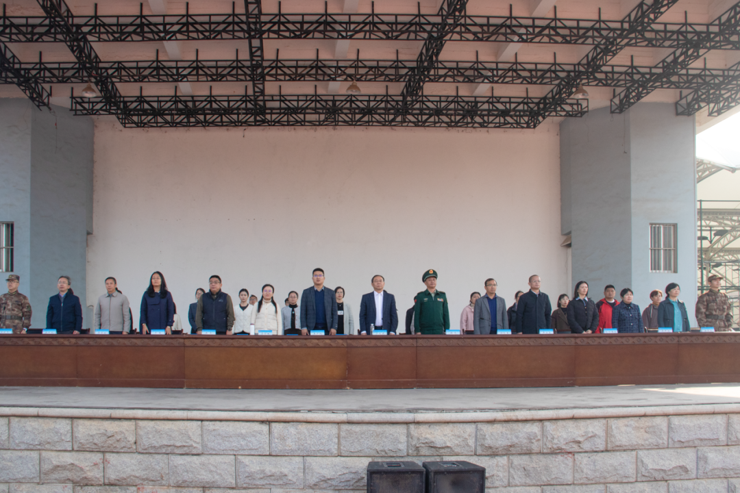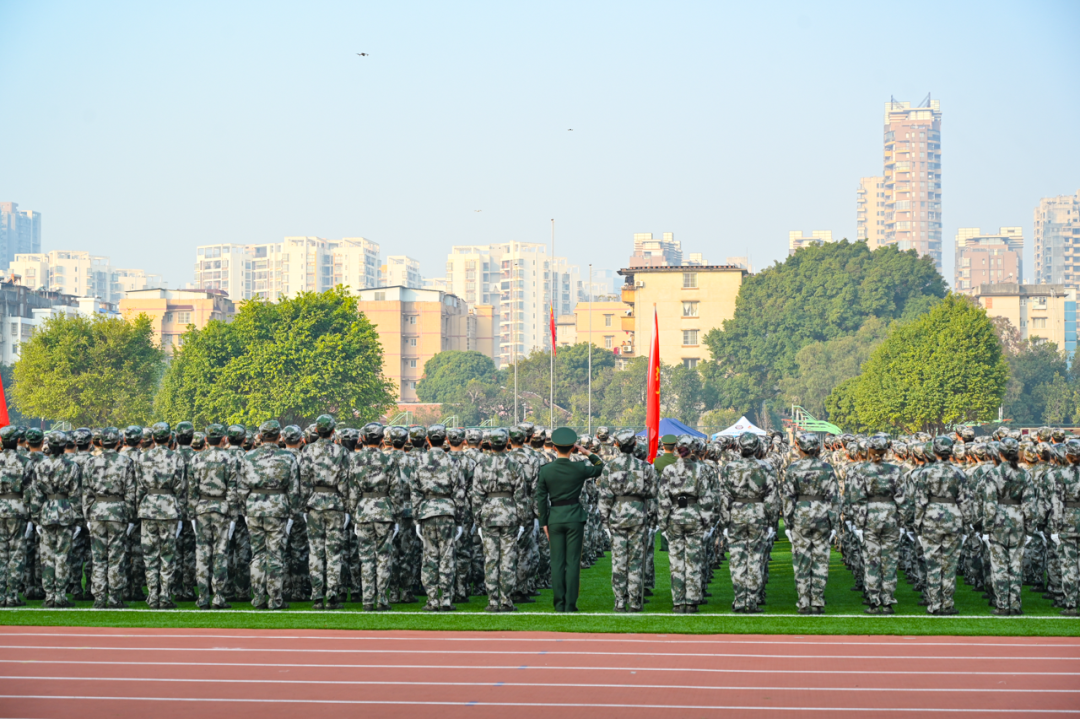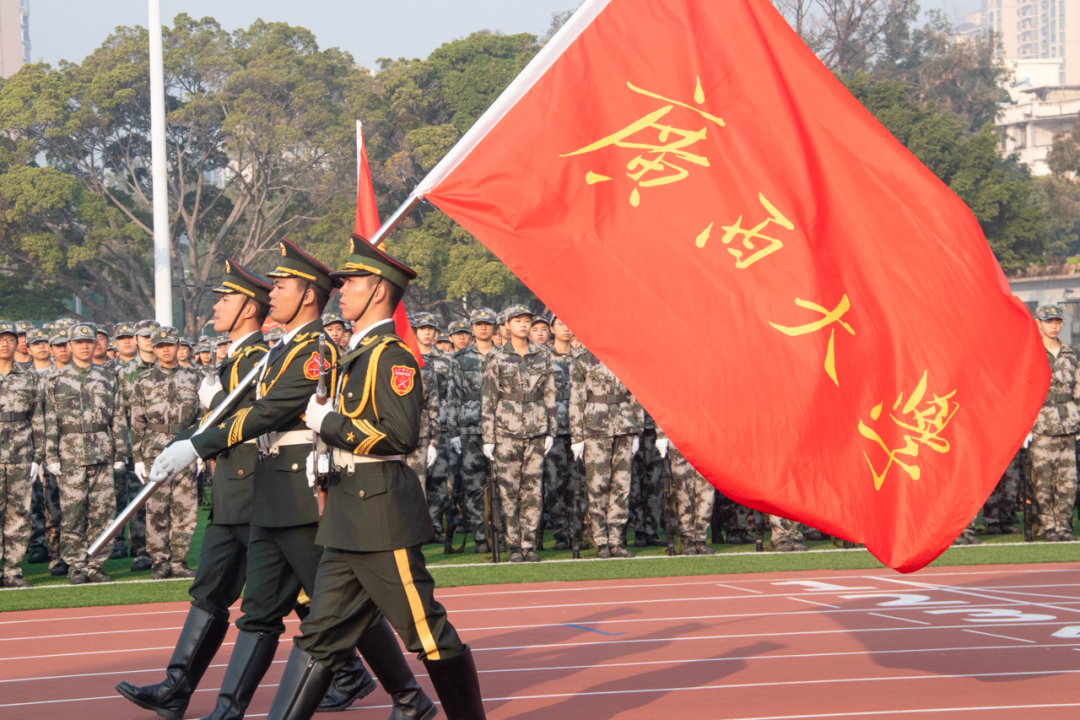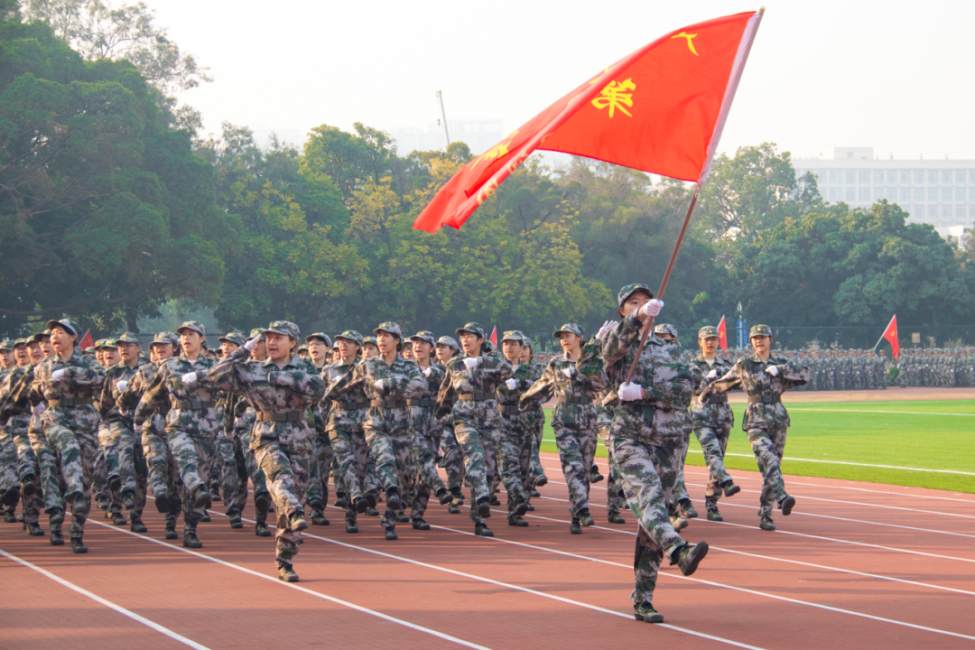 红旗冉升,奏唱国歌。军训汇演拉开帷幕。