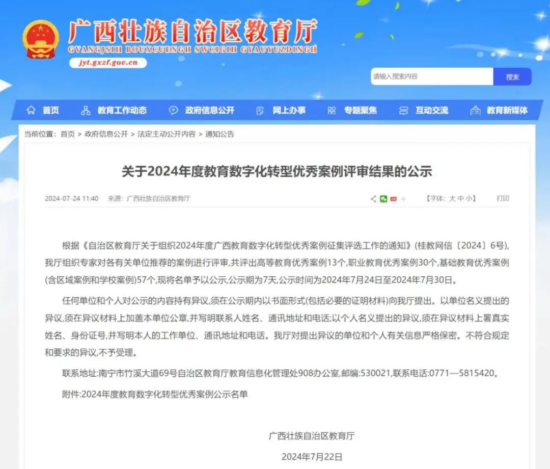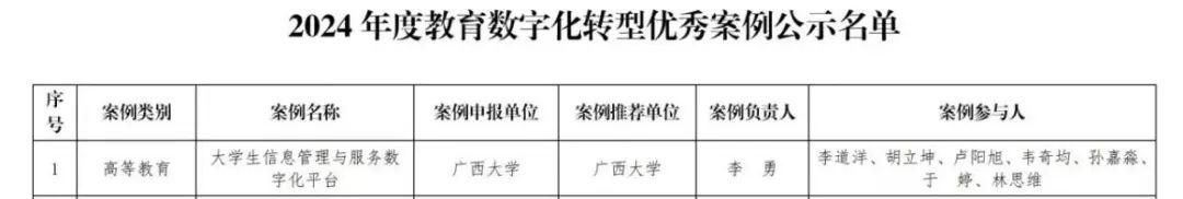 我院的《大学生信息管理与服务数字化平台》入选广西壮族自治区教育厅公布的2024年度教育数字化转型优秀案例名单优秀案例。