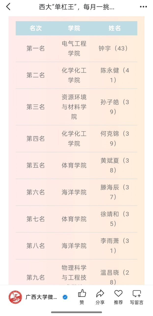 太阳成集团122ccvip首届 “单杠王”挑战赛于3月27日开赛,该活动每月开展一次竞技比拼。电自235班钟宇同学在3月、4月的挑战中分别获得第一名、第二名;研234班郑圣祺同学获得4月挑战赛的第十名,展现电气学子良好的精神风貌。