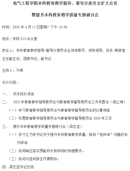 学院定于4月11日下午15:00在学院315召开2021-2022(2)学期扩大会议暨提高本科教育教学质量专题研讨会。会议议程如下: