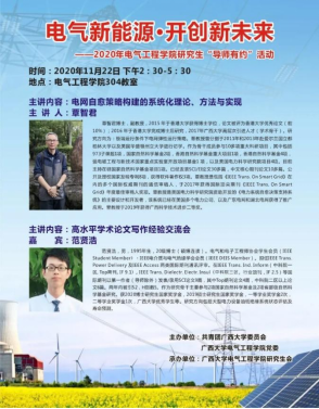 在第72期“导师有约”活动中,我院研究生会邀请覃智君副教授和范贤浩博士,为同学们带来以“电气新能源·开创新未来”为主题的学术讲座。本次讲座拓展了学生的学术视野,提升了学生的科研素养和创新能力,获得了同学们的一致好评,反响热烈并被校研究生会微信公众号报道。