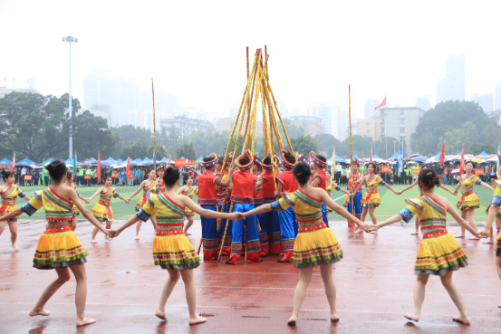 合着《幸福山歌》的节奏,舞狮、竹竿舞等民族传统节目纷纷闪亮登场。