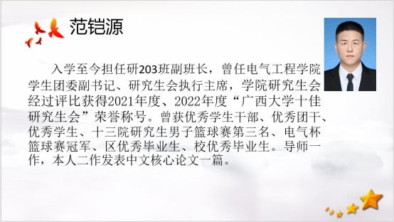 会议第四项为优秀毕业生党员经验分享会。本次大会邀请到了刘岩松、邱耀、范铠源、李钰4名优秀毕业生党员为大家作经验分享。刘岩松分享了自己找工作的心路历程,邱耀分享了自己的科研经验和兴趣爱好,范铠源就科研、学生工作、就业以及生活四个方面分享了自己的小妙招,李钰就科研学习、数模竞赛、求职应聘3个方面分享了自己的小技巧。他们鼓励大家要明确方向,勇于尝试,突破自己,为自己研究生生涯谱写精彩篇章。