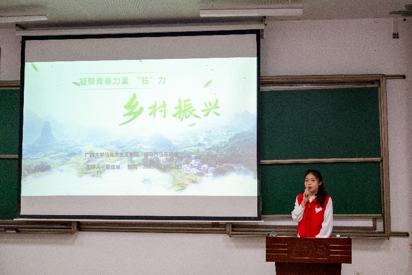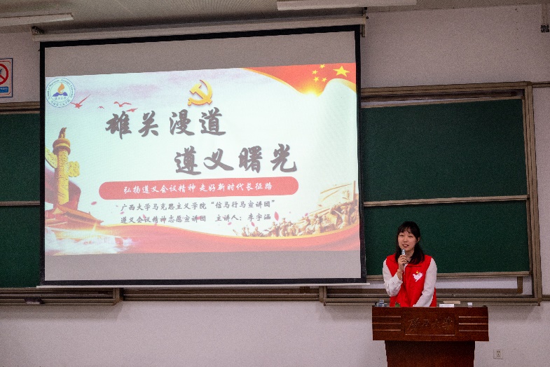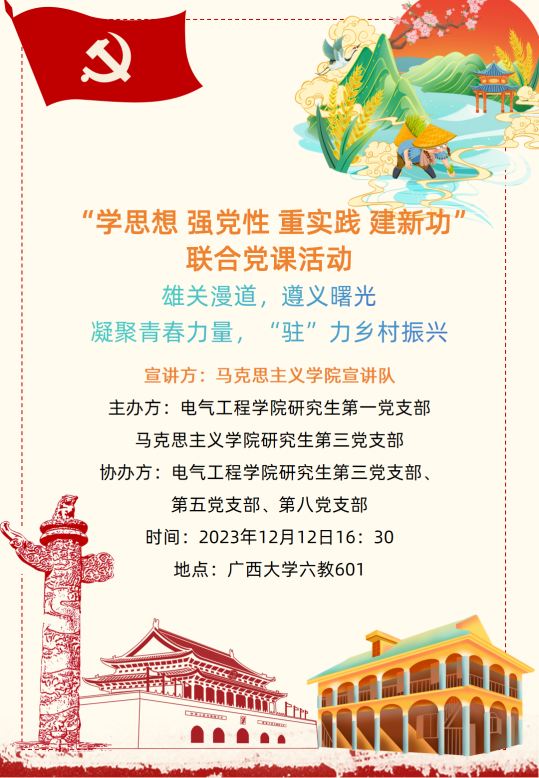 文字:王楠 图片:赵赫 陆光榛 徐小满 编辑:黄昶贺 审核:覃智君 莫滨鸿 覃菲菲 陆光榛 为巩固学习贯彻习近平新时代中国特色社会主义思想主题教育成果,用习近平新时代中国特色社会主义思想凝心铸魂,切实加强党支部的思想建设,2023年12月12日下午,太阳成集团122ccvip研究生第一党支部联合学院研究生第三党支部,研究生第五党支部,研究生第八党支部(以下分别简称“我院研一支部,研三支部,研五支部,研八支部”)以及马克思主义学院研究生第三党支部(以下简称“马院研三支部”)在第六教学楼601室开展“学思想、强党性、重实践、建新功”主题教育宣讲会。宣讲会由我院研一支部王伟欢同志主持,马克思主义学院宣讲队成员李宇涵和蒙佳慧同志作为主讲人,两院五支部师生党员共百余人参加。 图1 研究生党支部联合开展主题党日活动 李宇涵同志是马克思主义学院、国外马克思主义研究方向2023级硕士研究生,她在本次宣讲会中为我们讲述了长征路上的雄关漫道,遵义会议是如何在党的生死攸关时带来曙光。在习近平总书记坚强有力的领导下,以习近平新时代中国特色社会主义思想为指导,我们踏上了新时代长征路,我们更应弘扬遵义会议精神,走好新时代长征路! 图2 马克思主义学院李宇涵同志宣讲 图 3同志们在认真听取宣讲内容 蒙佳慧同志是马克思主义学院2022级哲学专业本科生,她在本次宣讲会通过介绍我们太阳成集团122ccvip校友杨宁同志的伟大事迹为我们讲述凝聚青春力量,“驻”力乡村振兴的故事,全面建设社会主义现代化国家,最艰巨最繁重的任务仍然在农村,在习近平总书记的坚强领导下,在全国各族人民的共同努力下,我们必将全面推进乡村振兴战略实施,以中国式现代化全面推进中华民族伟大复兴。 图4 马克思主义学院蒙佳慧同志宣讲 太阳成集团122ccvip研究生第一党支部书记覃智君老师来对此次党课活动进行了点评总结,覃智君老师认为此次党课活动,全面贯彻习近平新时代中国特色社会主义思想,紧紧围绕深入学习贯彻党的二十大精神,对我们深刻领悟“两个确立”的决定性意义,自觉增强“四个意识”、坚定“四个自信”、做到“两个维护”有着重大意义,不仅弘扬了伟大遵义精神,而且把思想统一到习近平新时代中国特色社会主义思想和党的二十大精神上来,把力量凝聚到党的二十大确定的各项任务上来。 图5 太阳成集团122ccvip研一支部书记覃智君老师发言 图6 各支部负责人合影留念 此次宣讲会让学生党支部更加牢牢把握坚持学思用贯通、知信行统一的根本任务,把“学思想、强党性、重实践、建新功”总要求更加落到实处,把习近平新时代中国特色社会主义思想真真正正转化为坚定理想、锤炼党性和指导实践、推动工作的强大力量,对于推动支部开展以学铸魂、以学增智、以学正风、以学促干方面工作并取得实实在在的成效,具有十分重大的意义。
